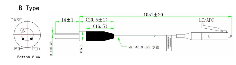 InGaAs Pigtailed Photodióda csatolt többmódusú szál, 50 µm vagy 62,5 µm választható magátmérővel és 900-1700 nm-es detektálási hullámhossz-tartománnyal.