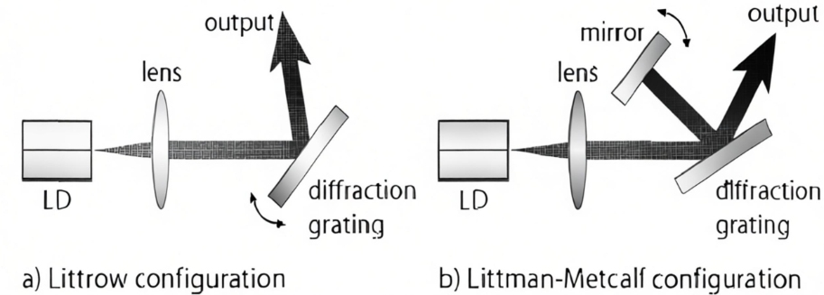 A rövid üregű főüreges lézerek, mint például a DFB és a DBR korlátozott, az üregen belüli fotonok interakciós idejével rendelkeznek, ami megnehezíti a mély vonalszélesség tömörítését. A vonalszélesség további tömörítése és a zaj elnyomása érdekében az ilyen rövid üregű főüreg-konfigurációkat gyakran kombinálják külső üreges struktúrákkal a teljesítmény optimalizálása érdekében. A gyakori külső üreges struktúrák közé tartoznak a térbeli külső üregek, a rostos külső üregek és a hullámvezető külső üregek. A száloptikai eszközök és hullámvezető szerkezetek kifejlesztése előtt a külső üregek túlnyomórészt téroptikából és különálló optikai komponensekből álltak. Ezek közül a rács alapú térbeli külső üreges visszacsatoló struktúrák főként a Littrow és Littman mintákat alkalmazzák, amelyek jellemzően lézererősítő üregből, csatolólencsékből és diffrakciós rácsból állnak. A rács, mint visszacsatoló elem, lehetővé teszi a hullámhossz hangolását, az üzemmód kiválasztását és a vonalszélesség tömörítését.